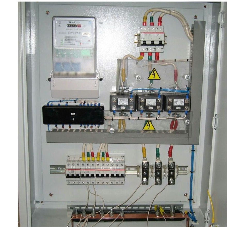 В щите устанавливается счётчик, испытательная коробка и трансформаторы тока.