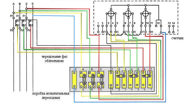 На рисунке ниже представлена электрическая схема подключения счетчика через испытательную клеммную коробку: