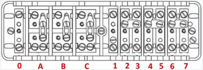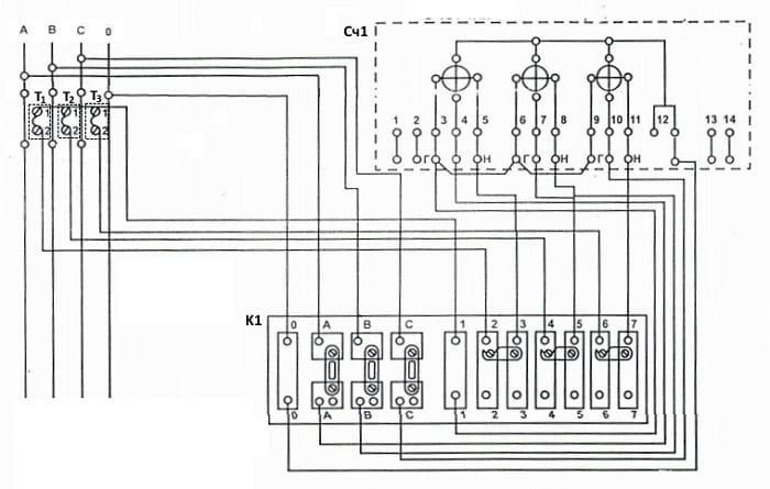 С трансформаторов провод приходит на клеммы 1-7. Далее посредством перемычек уходит на счетчик. При необходимости снять электросчетчик, перемычки раскручиваются, и сдвигаются, разрывая цепь. Это позволяет снять сетевое напряжение и обеспечить безопасную работу с устройством, подключенным к испытательной коробке.