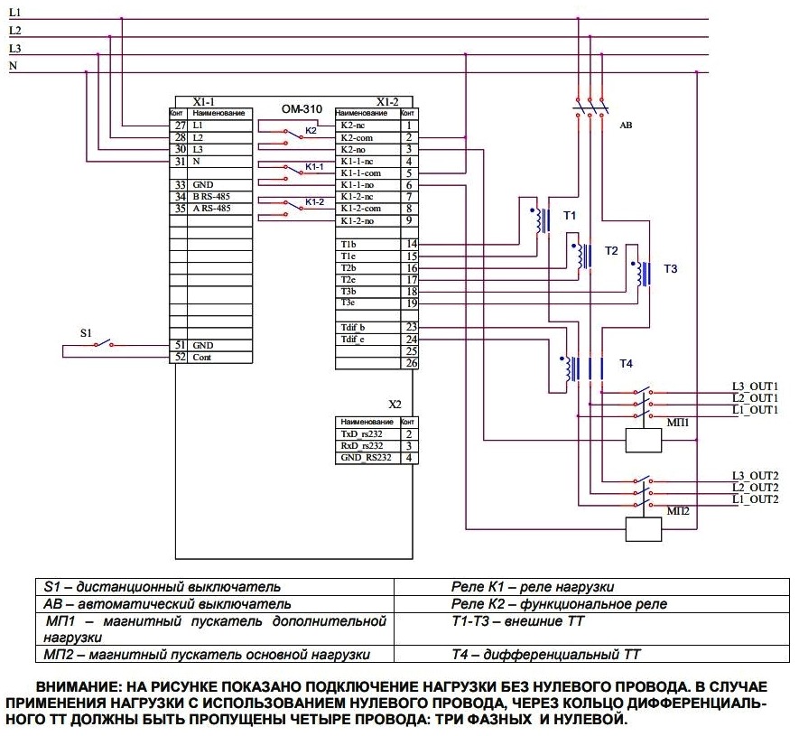 ОМ-1 может работать самостоятельно, то есть производить отключение собственной контактной группой. Пользователь лишь выбирает схему монтажа по приоритету потребителей: с нормально замкнутыми или разомкнутыми контактами (см. иллюстрацию).