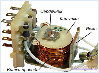 Реле представляет собой катушку, обмотка которой содержит большое количество витков медного изолированного провода. Внутри катушки находится металлический стержень (сердечник), закрепленный на Г-образной пластине, называемой ярмом. Катушка и сердечник образуют электромагнит, а сердечник, ярмо и якорь образуют магнитопровод реле.