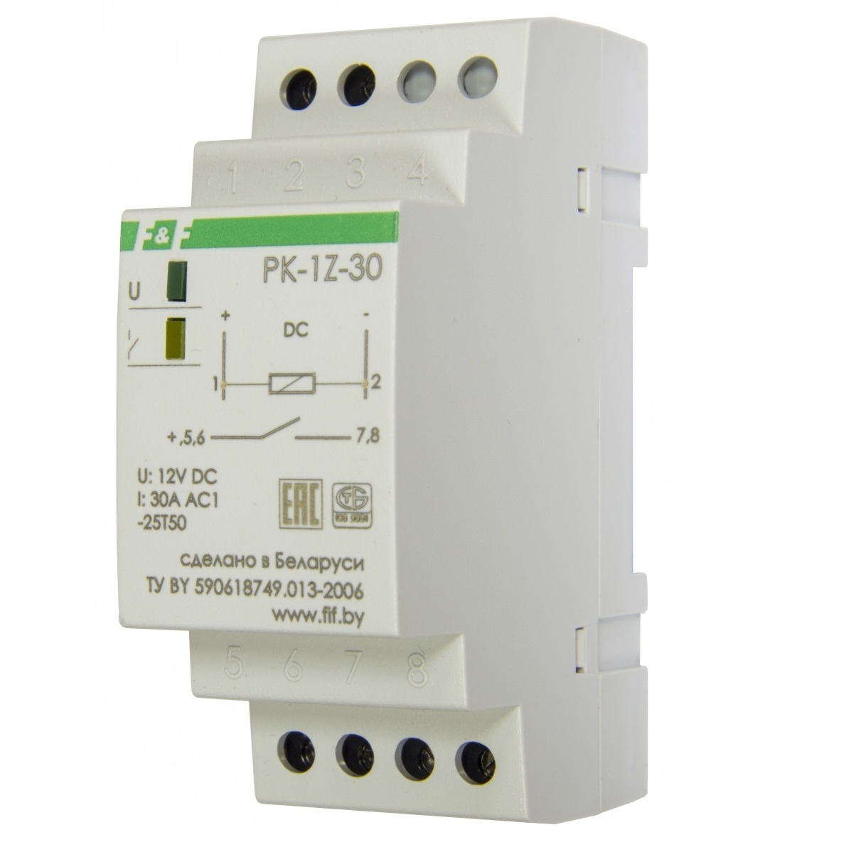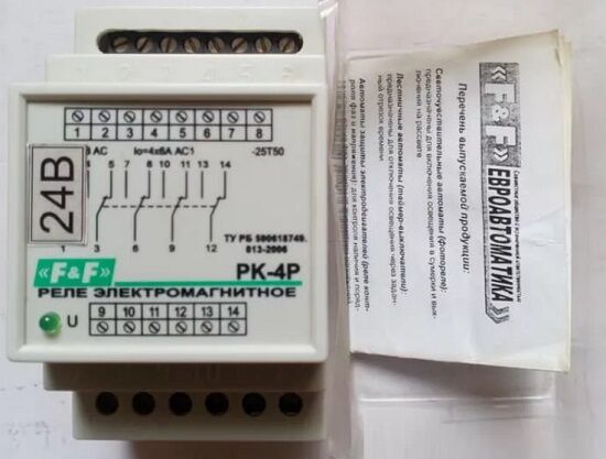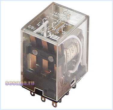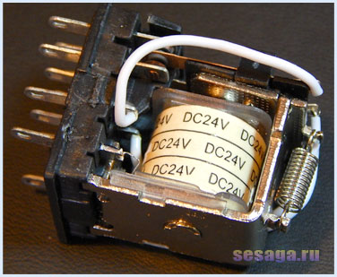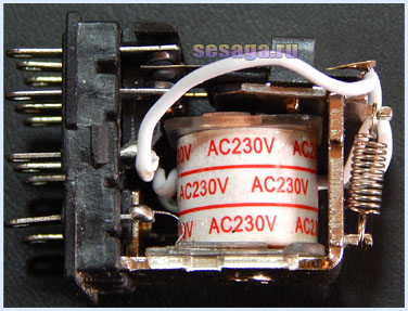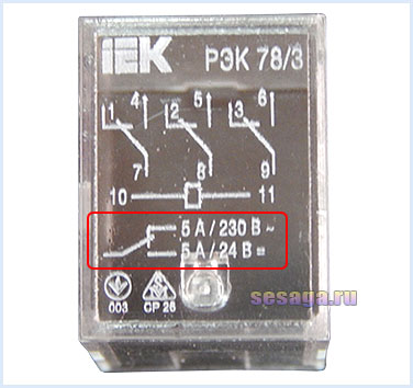 Контакты данного реле коммутируют переменный ток не более 5 А при напряжении 230 В, и постоянный ток не более 5 А при напряжении 24 В. Если же через контакты пропускать ток больше указанного, то они очень скоро выйдут из строя.