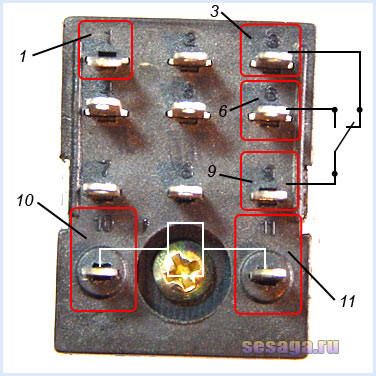На рисунке видно, что выводы катушки обозначены цифрами 10 и 11, и что реле имеет три группы контактов: