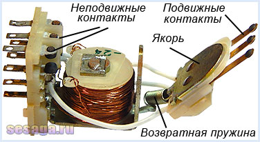 Первоначальное расположение Г-образной пластины (якоря) зафиксировано пружиной. Подавая на магнит ток, якорь, с находящимся на нем коммутирующим контактом преодолевает силы пружины и тянется к намагниченному полю.