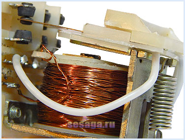 При передвижении хвостовик, расположенный на плоскости контакта, цепляет нижнюю контактную схему, перемещая ее вниз. Если на катушке прекращается подача электричества, пружина оттягивает назад ярмо и устройство принимает свой первоначальный вид.