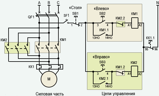 Реле может быть смонтировано в схему, где предусмотрено реверсивное движение двигателя. От схемы, которая была приведена выше различие заключается в том, что присутствует НЗ контакт, в реле, которое обозначено KK1.1.