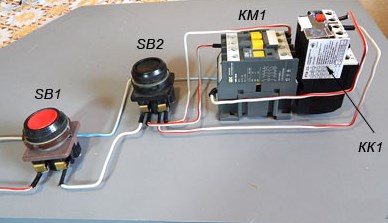 Когда замыкаются контакты, которые на схеме находятся под сокращением KM1, тогда происходит включение трех фаз, которые пускают ток через тепловое реле на обмотки двигателя, который включается в работу. Если сила тока будет расти, тогда из-за воздействия контактных площадок ТР под сокращением KK1 произойдет размыкание трех фаз и пускатель обесточивается, а соответственно останавливается и двигатель. Обычная остановка потребителя в принудительном режиме происходит посредством воздействия на клавишу SB1. Она разрывает первую фазу, которая прекратит подачу напряжения на пускатель и его контакты разомкнутся. Ниже на фото можно увидеть импровизированную схему подключения.