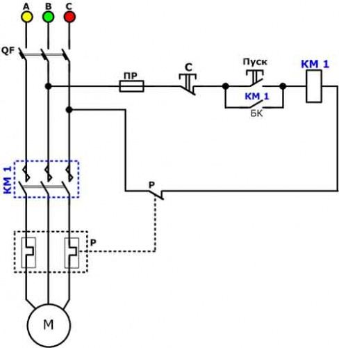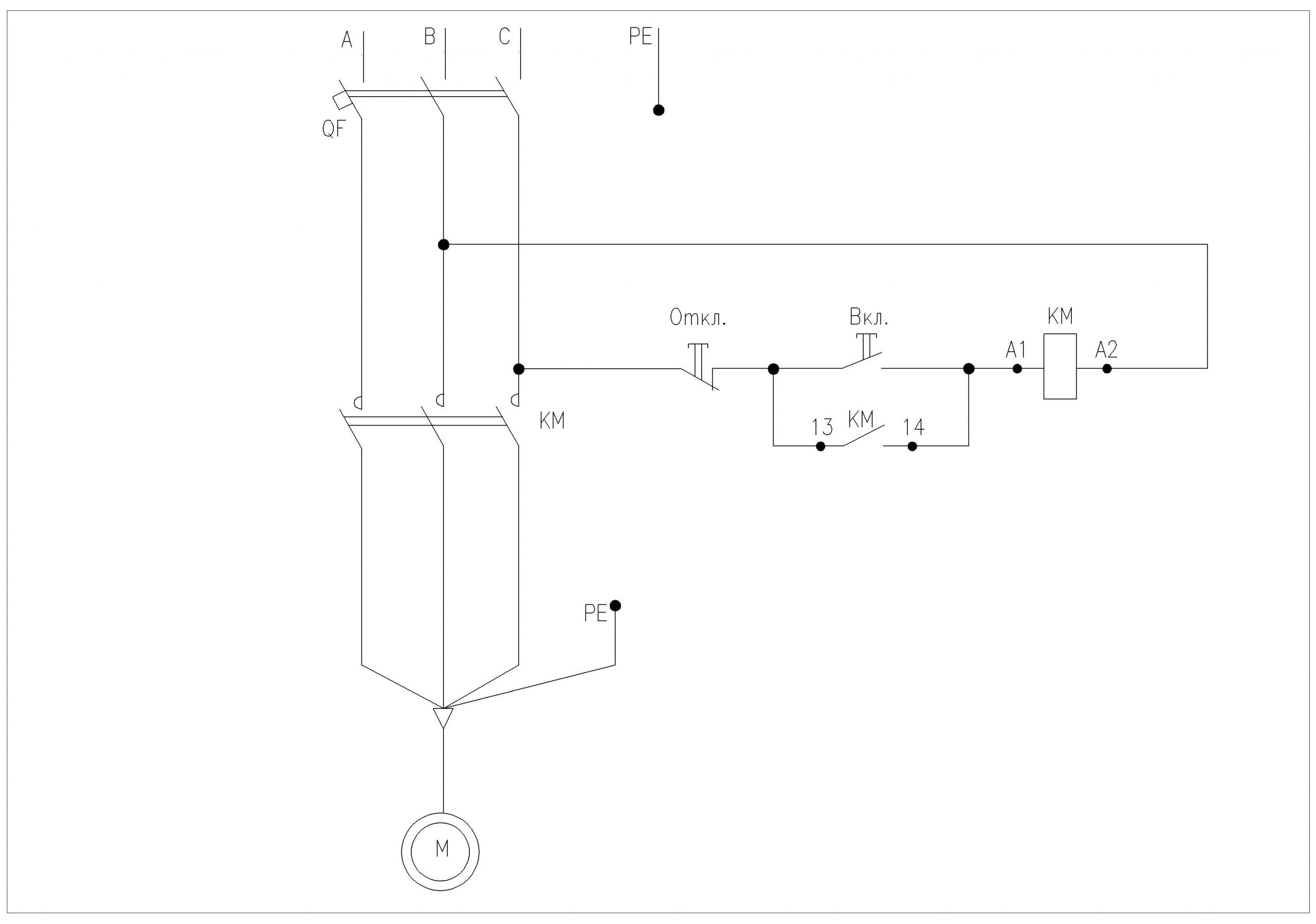 Типовая схема подключения двигателя через магнитный пускатель