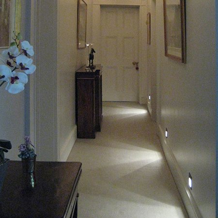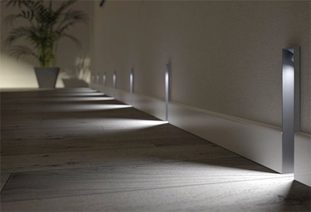 Первый случай рационально использовать, если идея обустройства подобной подсветки пришла к вам уже после того, как выполнена финишная отделка пола. Особенно удачно будет, если ваше желание совпадет с необходимостью или желанием поменять отделку стен. Ведь для того, чтобы вмонтировать светильники в стену, прежде всего, нужно обеспечить подвод электрического кабеля к месту монтажа. А значит, придется штробить стены. Лучше всего в данном варианте выполнить одну широкую штробу практически у самого пола, заложить в нее необходимое количество проводов, а затем обеспечить подвод каждого провода к точке. При таком расположении и кабеля потребуется гораздо меньше, и в будущем вы сможете в любом месте стены повесить полку или картинку и не переживать, что есть возможность забить гвоздь в провод. Но не следует делать штробу слишком низко. Не забывайте, что наверняка вам предстоит монтаж и напольного плинтуса.