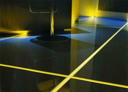 Довольно часто для подсветки пола используются неоновые лампы. Их главное отличие заключается в том, что поток света будет очень мягким и приятным. В случае использования точечных светильников свет будет более направленным. Так как система освещения, помимо самой лампы, будет включать специальный конвертер, лучше выбирать скрытый тип монтажа, который позволит скрыть все лишние детали. К тому же, главным недостатком неоновых светильников является хрупкость их колб.