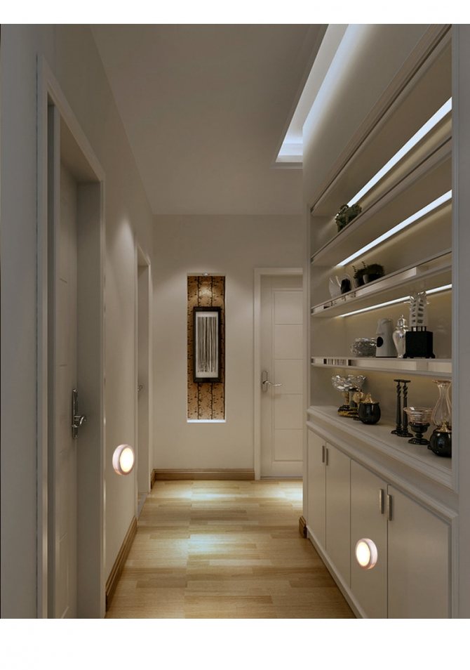 - Актуальна подсветка и в прихожей. Именно в это помещение в первую очередь попадают гости вашего дома, поэтому многие дизайнеры называют коридор визитной карточкой дома. Его интерьер не только должен быть лаконичным и функциональным, но и отвечать эстетическим требованиям. Зачастую коридор в квартирах со стандартной планировкой представляет собой длинный прямоугольник. В связи с этим часто одного лишь потолочного освещения бывает недостаточно. Конечно, если точечные светильники не расположены по всей длине потолка с малым шагом. Рекомендуется использовать многоуровневую комбинированную систему освещения. Например, несколько световых точек на потолке, подсветка шкафа-купе, если такой имеется и подсветка пола. Такой подход не только позволит наполнить все помещение полностью, но и сделает его просторнее;