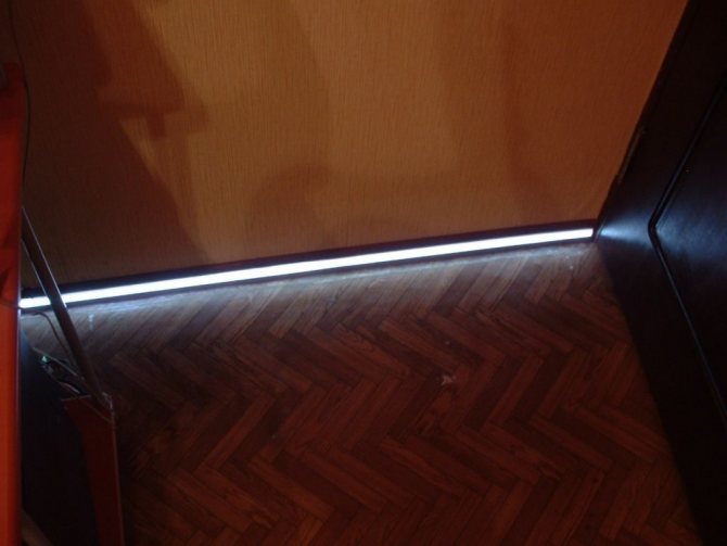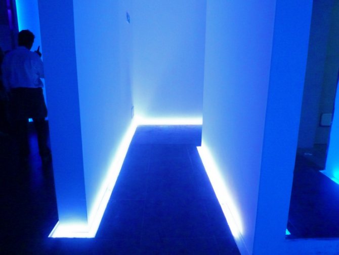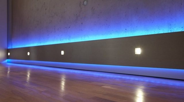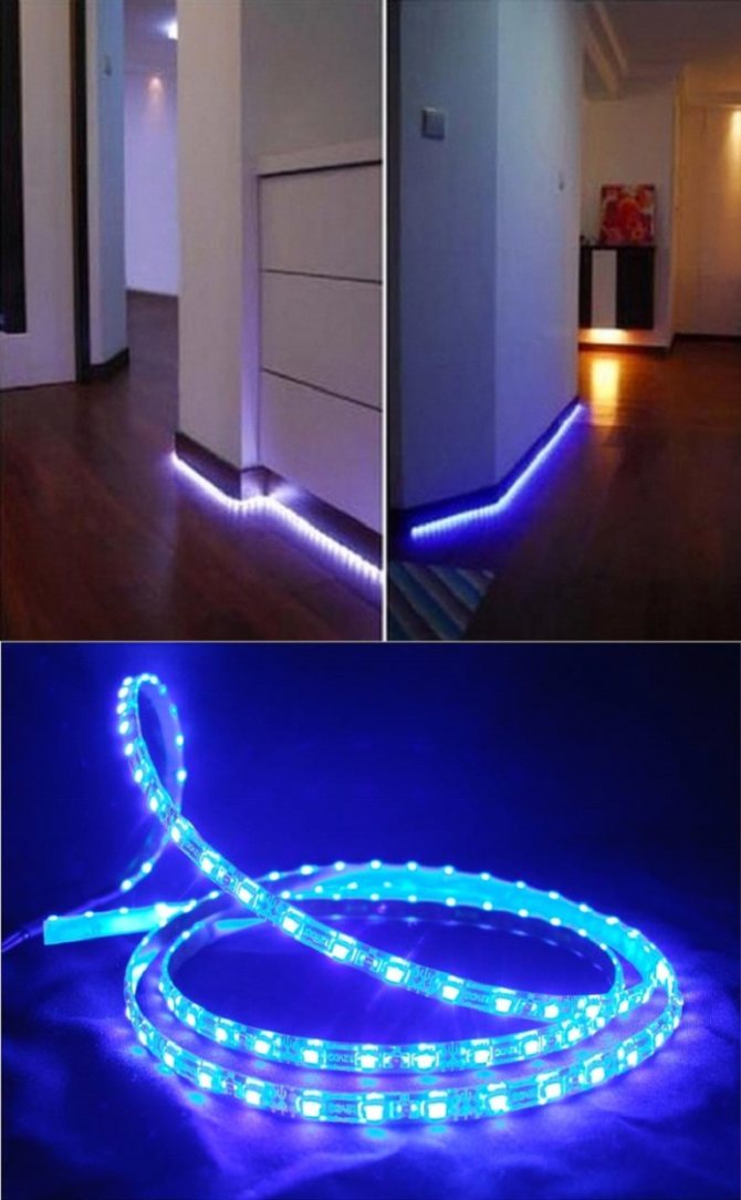 С помощью ленты можно создать наиболее подходящий тип подсветки пола – контурный. Но помните, что лента не должна быть слишком яркой. Такой свет может ослеплять и причинять дискомфорт.