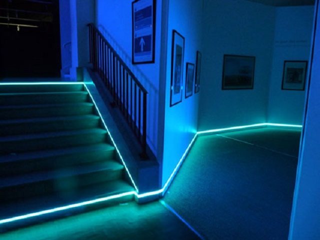 - Если в доме есть лестница, рекомендуется освещать не только напольное покрытие, но и ступени. Для этого можно применить светодиодные ленты, которые устанавливаются под поручнями и в специальных нишах на ступеньках.