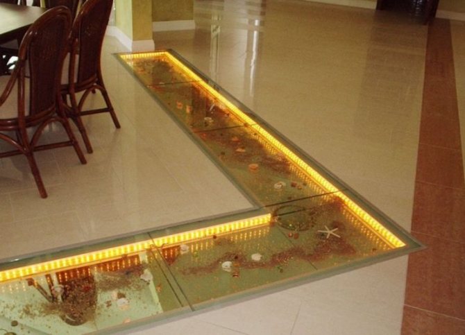 Из практических соображений под напольное остекление может быть отведена только какая-то часть перекрытия, например для свободного поступления дневного света, что служит пускай минимальной, но предпосылкой для экономии электричества. А возможен вариант и локального остекления пола, при котором оборудуется только ниша, оформляемая по вкусу заказчика. Часто ниша служит местом для освещаемого и заполненного различным декором сухого аквариума.