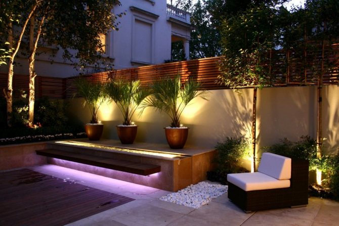 - Так как световой поток будет в данном случае направлен снизу вверх, он не должен быть слишком ярким и слепить или причинять дискомфорт. Особенно это касается подсветки на таких травмоопасных участках, как лестничные пролеты. Цель подсветки – лишь обозначить границы или задать направление, но ни в коем случае не выступать в роли дополнительного источника света. Поэтому вполне достаточно маломощных приборов с рассеивателями;