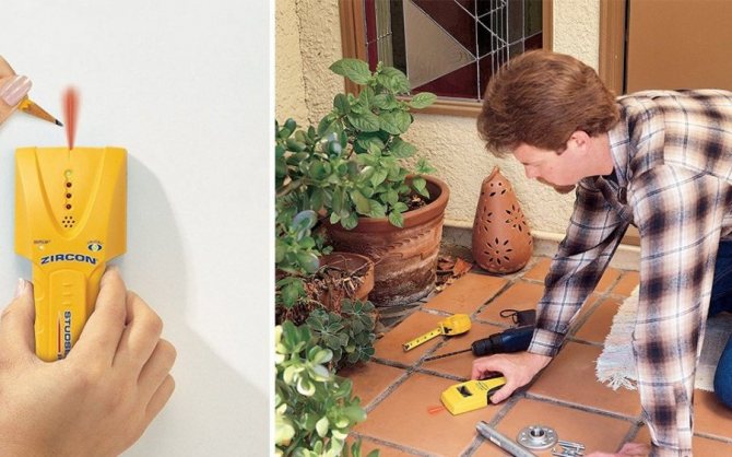 Это устройство напрямую предназначено для обнаружения скрытой в стене проводки. Детекторы по принципу работы могут быть электростатическими, электромагнитными и комбинированными. Первые довольно просты в работе и недорого стоят. Они позволяют обнаружить скрытую проводку и оборванные провода, которые остаются под напряжением. Однако при высокой влажности в помещении они дают ложные срабатывания.