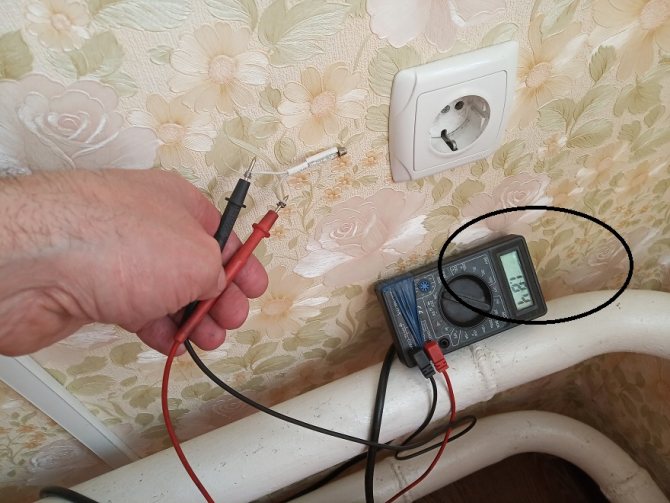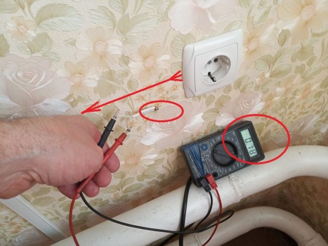 К оставшимся двум подключают отводы мультиметра. Его переводят в режим работы омметра, не обращая внимания на полярность. Удлиненную антенну подносят к основанию, медленно веду вдоль него. В процессе важно наблюдать за показаниями. Любое их изменение укажет на близкое расположение провода.