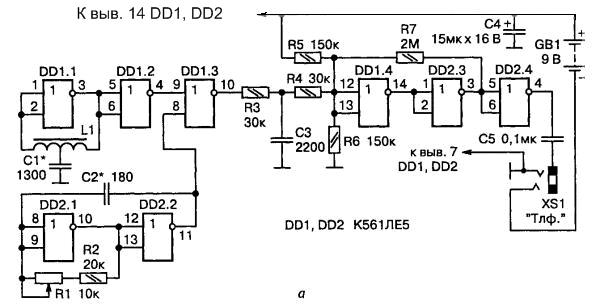 С выходного элемента меандр через емкость С5 поступает на телефон, у которого сопротивление должно быть примерно 0,1 КОм. Так как емкость и активное сопротивление телефона образуют диффенцирующую RC цепочку, то на подъеме и спаде меандра будет образовываться импульс. В результате человек услышит щелчки с частотой в два раза превышающую разностную.