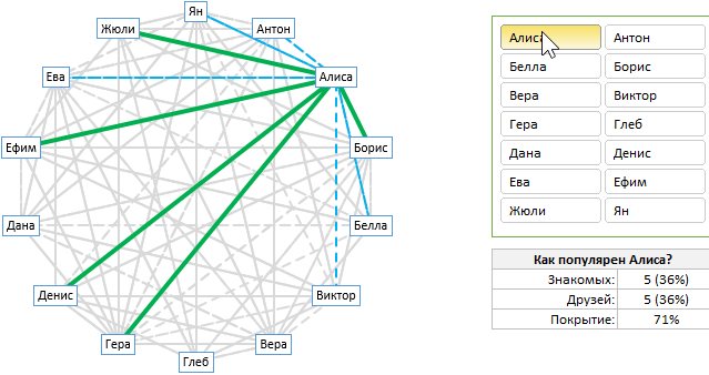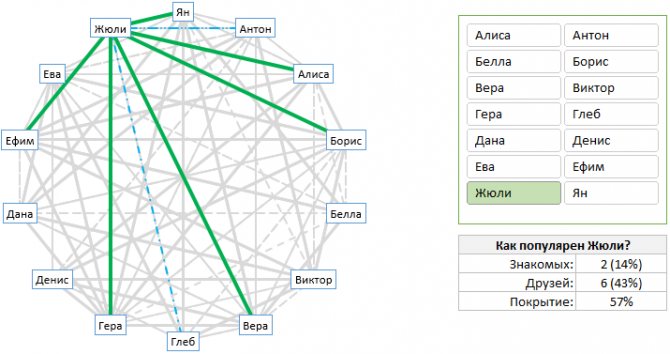 - Набор зеленых толстых и синих пунктирных линий, представляющих отношения для выбранного конкретного участника сетевой группы.