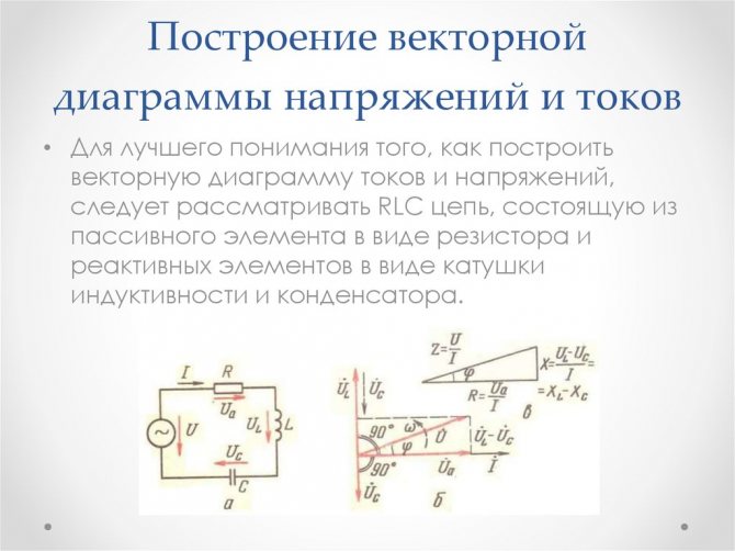 При построении векторных диаграмм для цепей с последовательным соединением элементов за базовый (отправной) вектор следует принимать вектор тока (см. лекцию № 8), а к нему под соответствующими углами подстраивать векторы напряжений на отдельных элементах. Для цепей с параллельным соединением элементов за базовый (отправной) вектор следует принять вектор напряжения (см. лекцию № 8), ориентируя относительно него векторы токов в параллельных ветвях.