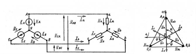 Вообще говоря, совсем не обязательно принимать одинаковые положительные направления во всех фазах. Однако принимать разные положительные направления в разных фазах неудобно, так как пришлось бы изображать несимметричную систему векторов при работе электрической цепи в нормальном симметричном режиме, когда все три фазы находятся в одинаковых условиях.