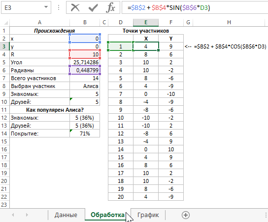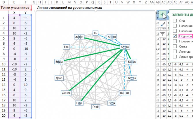 Осталось еще добавить подписи данных. Для этого используем вторую таблицу с базовыми координатами точек участников при создании еще одного ряда: