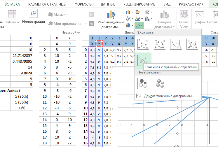 Начнем сначала с построения серых пунктирных линий для отображения всех слабых связей между участниками. А потом сделаем те же самые действия для серых сплошных линий сильных связей. Выделите диапазон ячеек I3:J43 и выберите инструмент: «ВСТАВКА»-«Диаграммы»-«Точечная с прямыми отрезками».