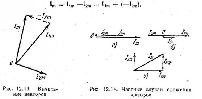 При анализе разных электрических схем возникает необходимость складывать или вычитать векторы тока и напряжения. Сложение векторов производится геометрическим суммированием по правилу параллелограмма, как показано на рис. 1-8, а, на котором построена сумма токов