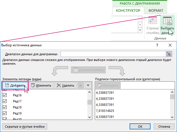 Затем из дополнительного меню: «РАБОТА С ДИАГРАММАМИ»-«КОНСТРУКТОР»-«Выбрать данные» в окне «Выбор источника данных» используйте кнопку «Добавить» для добавления остальных 20-ти рядов: