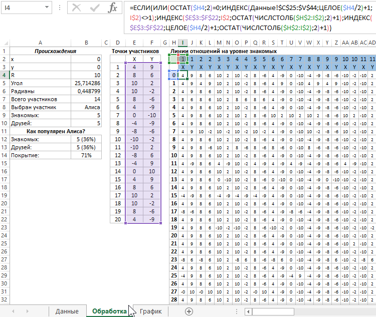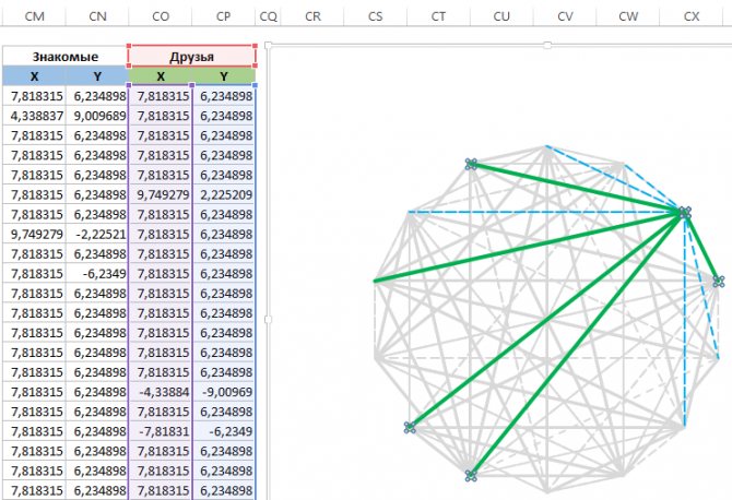 Как видно выше на рисунке было создано всего 43 ряда для лучевой диаграммы связей взаимоотношений участников рынка. Для добавления большого количества рядов на график можно создать макросы, в данном случае можно все седлать вручную.