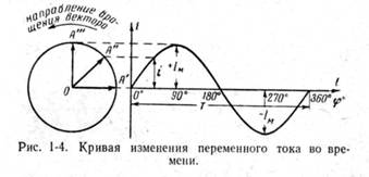 На рис. 1-4 приведена кривая изменения переменного тока во времени. Ток сначала растет от нуля (при = 0°) до максимального положительного значения + I M (при = 90°), затем убывает, переходит через нуль (при = 180°), достигает максимального отрицательного значения — I M (при = 270°) и, наконец, возвращается к нулю (при = 360°). После этого весь цикл изменения тока повторяется.