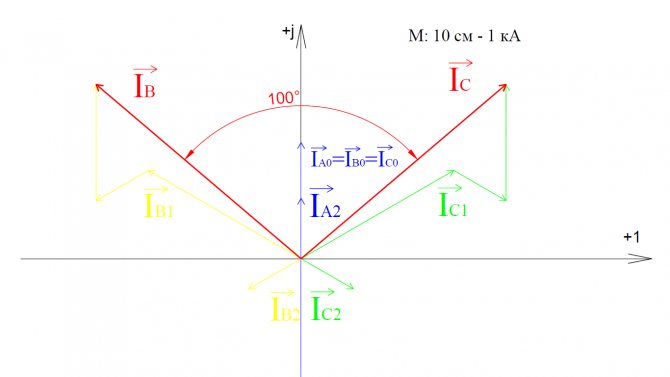 Длина вектора тока / ф.А / = 34,8 А/ 5 А/см = 6,96 см; длина его действительной части