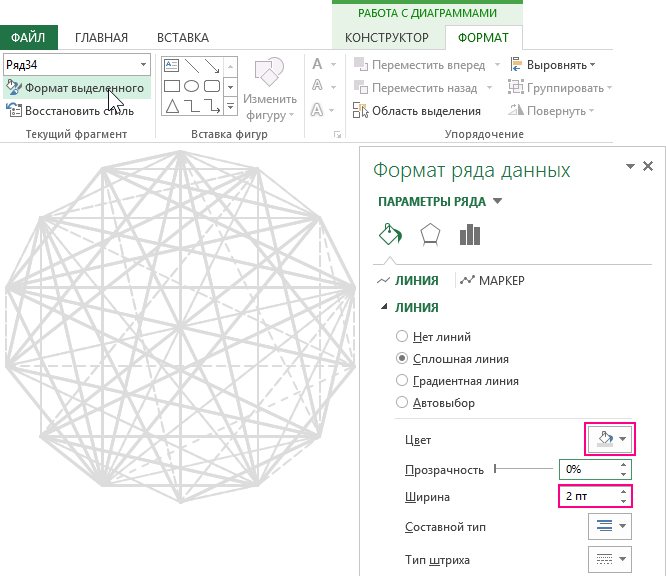 Для каждой линии нужно присвоить один и тот же формат. Удобно выбирать ряды линий из дополнительного меню: «РАБОТА С ДИАГРАММАМИ»-«ФОРМАТ»-«Текущий фрагмент». Из выпадающего списка выбираем необходимый нам ряд, а ниже жмем кнопку «Формат выделенного» чтобы приступить к форматированию: