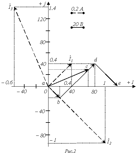 При построении векторной диаграммы зададимся масштабами токов и напряжений (см. рис. 2). Векторную диаграмму можно строить, имея запись комплекса в показательной форме, т.е. по значениям модуля и фазы . Однако на практике удобнее проводить построения, используя алгебраическую форму записи, поскольку при этом вещественная и мнимая составляющие комплексной величины непосредственно откладываются на соответствующих осях комплексной плоскости, определяя положение точки на ней.