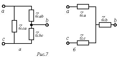 В ряде случаев могут встретиться схемы, соединения в которых нельзя отнести ни к последовательному, ни к параллельному типу (см. рис. 7). В таких случаях преобразования носят более сложный характер: преобразование треугольника в звезду и наоборот.