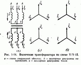 В рассматриваемом случае имеет место соединение трансформатора по схеме 1/1-12. Соответственно для трехфазного трансформатора схема соединений и векторная диаграмма токов и напряжений показаны на рис. 1-14.