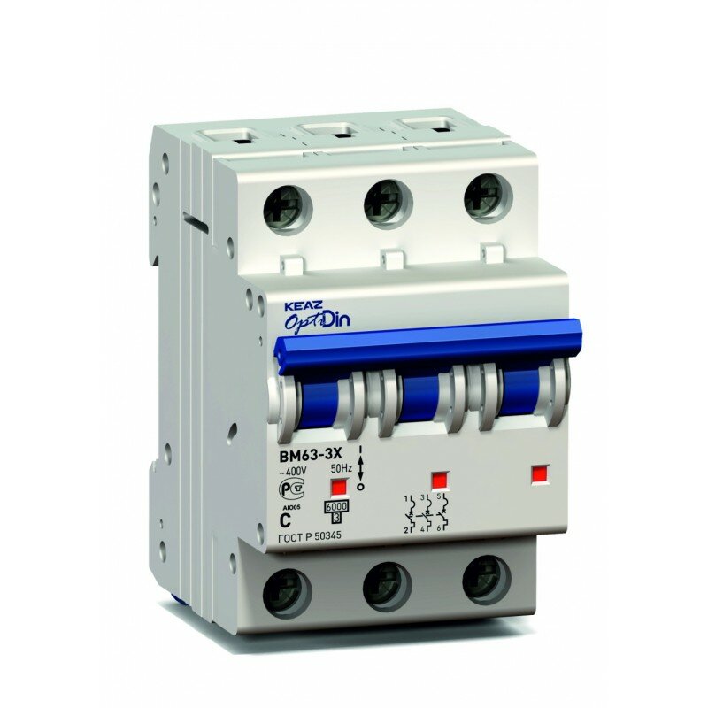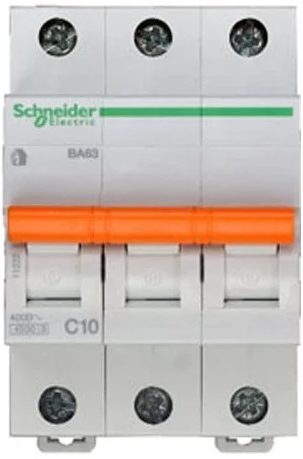АВ относится к типу расцепления C, аппарат предпочтителен для установки в домашние электрические щитки. Количество полюсов составляет три пункта, номинальное напряжение выдерживает до 380 вольт. Отключающая способность составляет 6 кА. Нацелен на защиту по классу IP 20. Управление механизмом рычажное. Устанавливается на DIN-рейку. Средняя цена: 800 рублей.