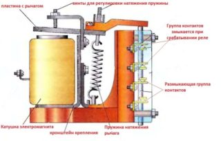 Обмотка катушки содержит большое количество витков изолированного медного провода. Внутри расположен металлический сердечник, который закреплен Г-образной пластиной (ярмо). Над катушкой установлена пластина или якорь. Он выполнен из металла и удерживается возвратной пружиной. Подвижные контакты закреплены на якоре. Пара неподвижных контактов расположена напротив. Сердечник и катушка вместе образуют электромагнит. Такие детали, как ярмо, сердечник, и якорь – это составные части магнитопровода.