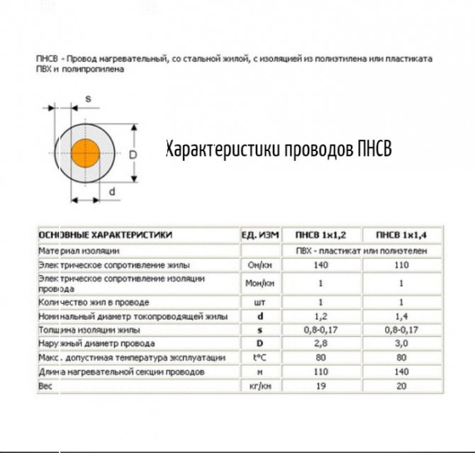 Нагревающие провода, в частности ПНСВ, имеют следующие параметры и показатели: