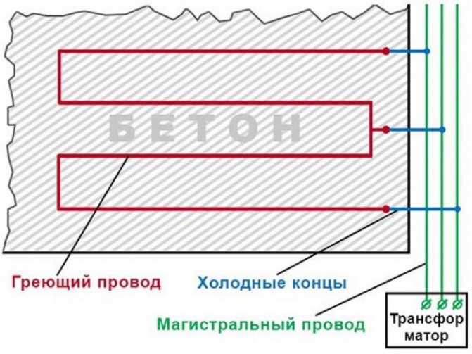 Чтобы предотвратить нежелательные и опасные для здоровья и жизни человека последствия, обязательно осуществляют прогрев бетона в зимнее время специальными проводами. Расчет метража и схемы прокладки проводят на этапе проектирования здания.