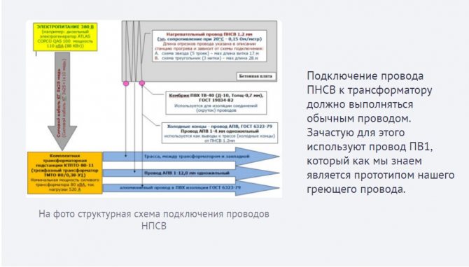 - «горячие» контактные соединения производятся в бетоне, при этом рабочие (горячие) участки пнсв присоединяются к «холодным» проводникам из меди или алюминия, которые, в свою очередь, подключаются к трансформатору.
