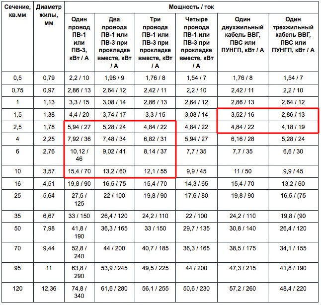 Сечение мм² | Диаметр жилы, мм | Мощность/сила тока (кВт/А, ампер) |