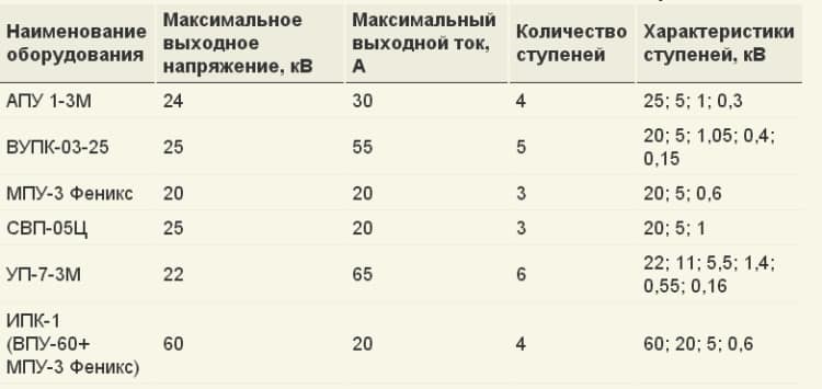 Наименование оборудования | Максимальное выходное напряжение, кВ | Максимальный выходной ток, А | Количество ступеней | Характеристики ступеней, кВ |