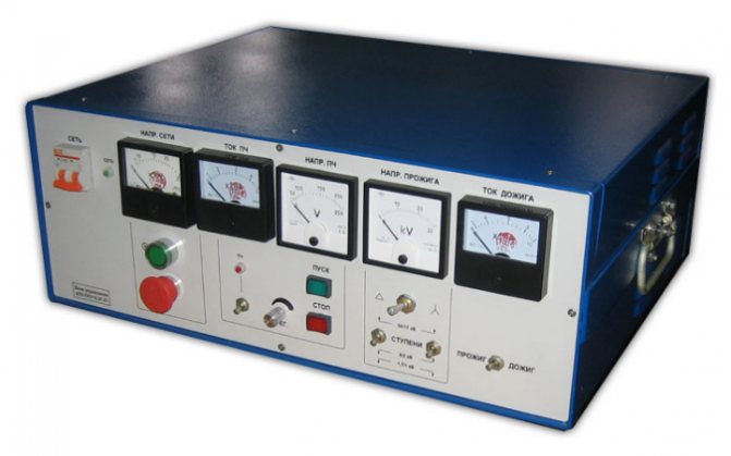 Для генерации высокого напряжения в конструкции прожигающих установок используются либо масляные трансформаторы, либо «сухие» трансформаторы — силовые транзисторы (Таблица 4). Вопрос автоматического переключения ступеней без разрыва дуги решен в обоих типах устройств, однако существует мнение, что только сухие трансформаторы могут обеспечить непрерывный прожиг в любых условиях. Связано данное явление с разным энергопотреблением двух видов трансформаторов в режиме короткого замыкания. Масляные трансформаторы имеют существенно большее энергопотребление в режиме короткого замыкания, поэтому держать их включенными одновременно в процессе всего прожига неэффективно, следовательно, при понижении напряжения происходит отключение источника с масляным трансформатором, генерирующего более высокое напряжение.