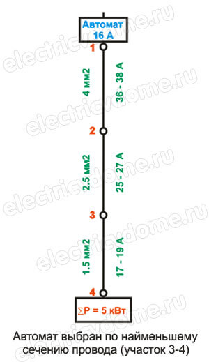 Расчет автомата по мощности (по номинальному току электроприемника) производят, если провода по всей длине на всех участках электропроводки рассчитаны на такую нагрузку. То есть допустимый ток электропроводки больше номинала автомата.