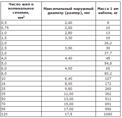 Сечение, кв. мм | Максимальный наружный диаметр, мм | Масса 1 км кабеля, кг |