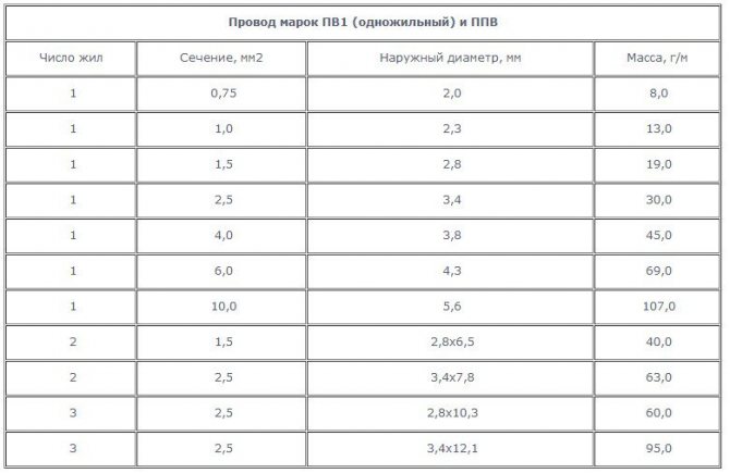 Для начала обратите внимание на таблицу, в которой представлена зависимость площади сечения ПВ1 и массы: