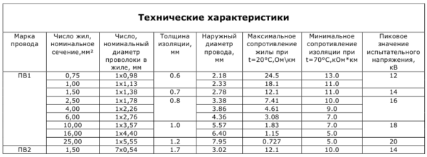 Однако более важными считаются электрические характеристики любого провода. И если по механическим параметрам ПВ1 не так хорош, то по электрическим проявляет себя с лучшей стороны.