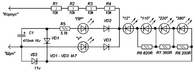 Исполнение может быть различным, в зависимости от назначения: только индикация, поиск пробоя, измерение точного значения напряжения, установление диапазона (220 В, 380 В). В качестве примера, на иллюстрации электрическая схема прибора, определяющего наличие фазы на измеряемом участке и приблизительного порога напряжения.