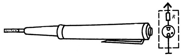 - на одном конце указателя имеется щуп для контакта с проверяемым участком цепи, на противоположном — контактная площадка для касания пальцем оператора;
